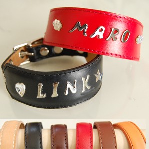 イニシャル(名前)首輪はお客様がすきなイニシャルスタッズや飾りスタッズやわんちゃんの名前を組み合わせて世界に一つだけのオーダーメイド首輪をハンドメイドで職人が制作します。